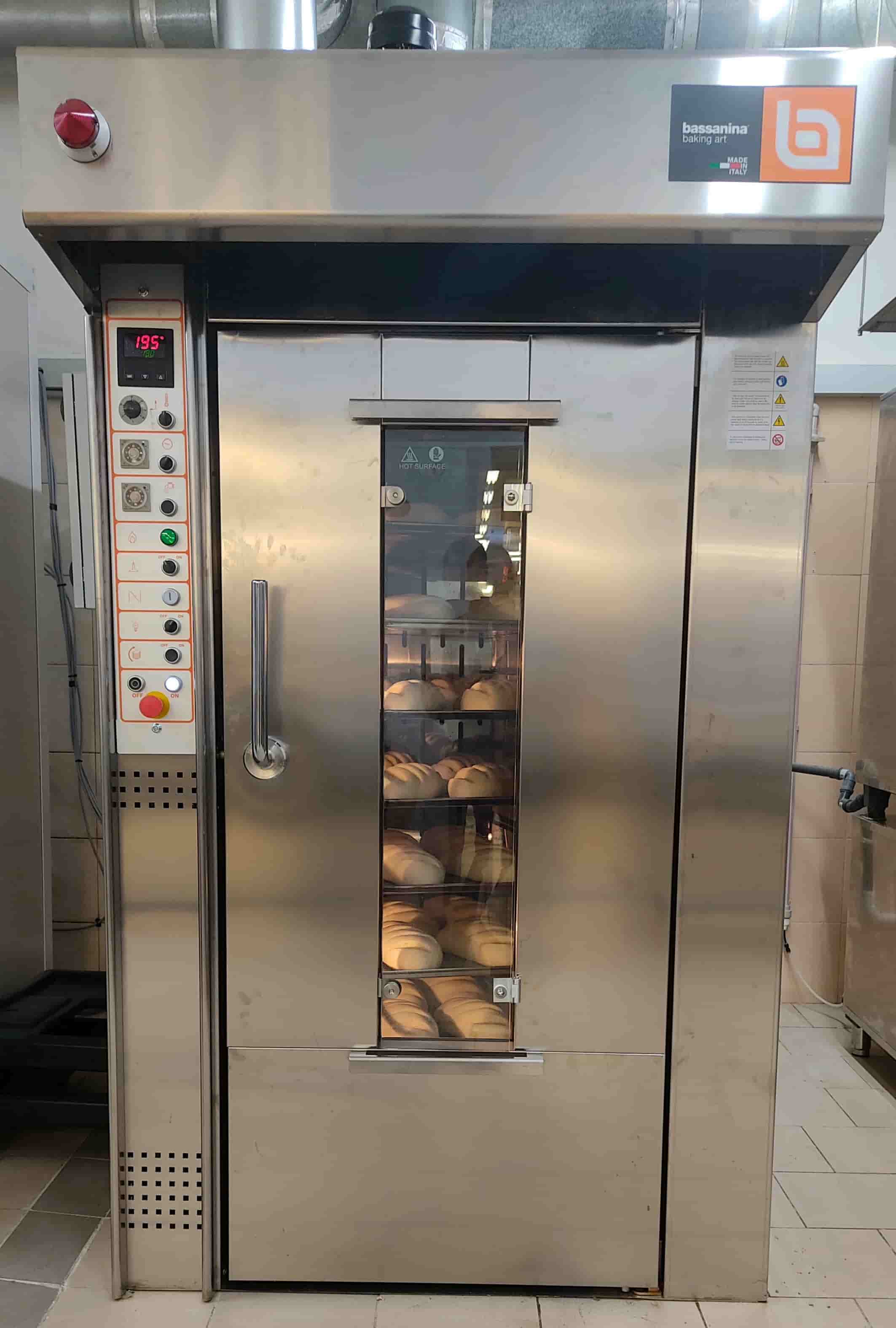 Выпечка осуществляется с использованием ротационной печи Bassanina Rotor 57 с платформой, которая обеспечивает равномерный прогрев и высокую производительность, а также печи Unox XB 893 и XEBC-10EU-E1RM для расширения ассортимента выпекаемой продукции. Дополнительно пекарня оснащена хлеборезкой Rollmatic C52, индукционной плитой, а также профессиональными алюминиевыми противнями Bassanina формата 40×60 — багетными и гладкими с бортом. Для продления срока его службы установлены водоумягчители DVA LT12.