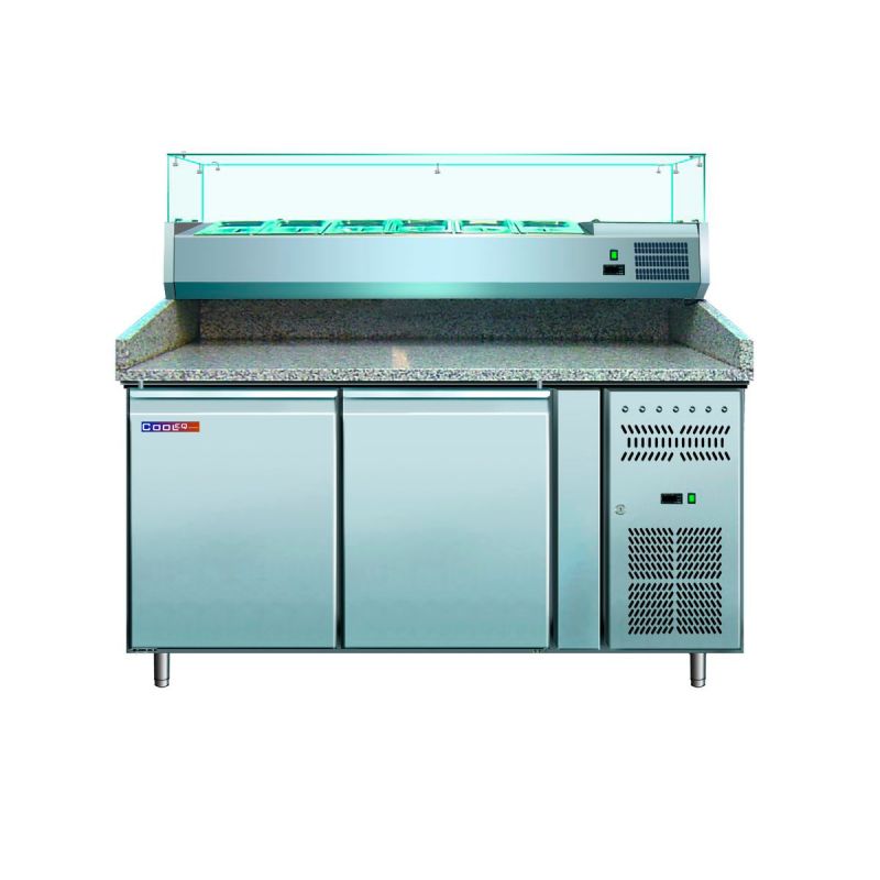 Стол холодильный саладетта для пиццы COOLEQ PZ2600TN-VRX380 сочетает в себе холодильный стол, рабочую поверхность для приготовления пиццы и охлаждаемую витрину для ингредиентов, благодаря чему повар получает полностью укомплектованную станцию для быстрой сборки пиццы, салатов и других блюд. Корпус оборудования выполнен из высококачественной нержавеющей стали, устойчивой к коррозии, механическим повреждениям и интенсивной ежедневной эксплуатации на профессиональной кухне, что обеспечивает долговечность, гигиеничность и простоту ухода. Рабочая поверхность изготовлена из натурального гранита — идеального материала для работы с тестом: он прочный, износостойкий, устойчив к влаге и перепадам температуры, а также обеспечивает удобную поверхность для раскатки и формования теста. Дополнительный гранитный борт высотой 150 мм защищает стену от загрязнений и повышает практичность использования оборудования. В конструкции стола предусмотрен вместительный холодильный шкаф объемом 428 литров с двумя удобными дверями, позволяющий хранить большое количество заготовок, соусов, сыров и других ингредиентов, необходимых для приготовления пиццы. Температурный режим поддерживается в диапазоне +2…+8 C, что оптимально для хранения свежих продуктов и соответствует санитарным требованиям профессиональной кухни. Благодаря системе динамического охлаждения холод равномерно распределяется по всему внутреннему объему камеры, обеспечивая стабильную температуру и сохранение качества продуктов. Верхняя охлаждаемая витрина рассчитана на размещение 5 гастроемкостей GN 1/3 и 1 гастроемкости GN 1/2, что позволяет удобно организовать хранение ингредиентов прямо в зоне приготовления, ускоряя процесс работы повара и повышая производительность кухни (гастроемкости в комплект поставки не входят). Холодильный агрегат размещен сбоку, что облегчает доступ для технического обслуживания и повышает эффективность вентиляции оборудования. В качестве хладагента используются фреоны R290 и R600a.Характеристики