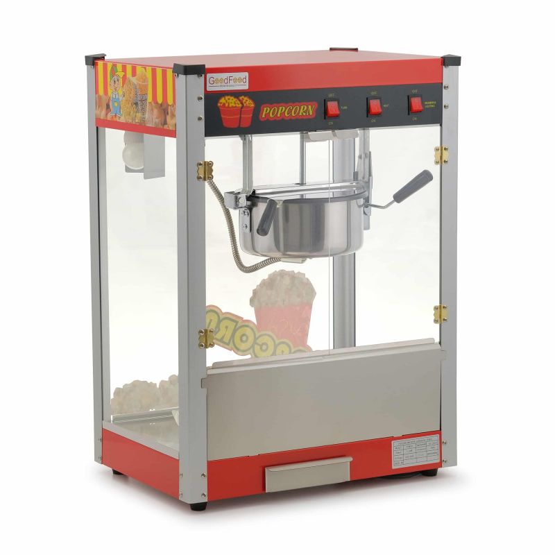Апарат для приготування попкорну GoodFood PCM10 дозволяє швидко організувати продаж одного з найпопулярніших снеків у світі. Попкорн давно став невід'ємною частиною кінотеатрів, торгових центрів, фуд-кортів, парків атракціонів і виїзних заходів, а візуальний ефект приготування — коли через прозорі міцні скляні стінки видно, як ароматні пластівці вилітають з гарячого котла і утворюють апетитну гору повітряної кукурудзи — додатково привертає увагу клієнтів і стимулює імпульсні покупки. Модель PCM10 оснащена металевою чашею об'ємом 250 мл з антипригарним покриттям, що забезпечує рівномірний прогрів зерна, запобігає пригоранню і спрощує очищення обладнання, а продуктивність на рівні 1 чаші за 2 хвилини дозволяє швидко обслуговувати потік покупців без простоїв. Зручна панель управління з трьома окремими кнопками — підсвічування, підігрів дна і підігрів чаші — дає можливість контролювати процес приготування і підтримувати готовий продукт теплим і хрустким, зберігаючи його свіжість протягом усього робочого дня. Корпус виконаний з міцної сталі в яскравому червоному кольорі з декоративними наклейками, що робить апарат помітним і привабливим елементом торгової точки, стійки з анодованого алюмінію сріблястого кольору забезпечують стійкість конструкції і довгий термін служби навіть при інтенсивній експлуатації. Завдяки компактним габаритам, мобільності і простоті підключення апарат для попкорну GoodFood PCM10 підходить для виїзної торгівлі, острівців в ТРЦ, кінотеатрів, барів і кафе, дозволяючи мінімізувати стартові інвестиції і швидко окупити обладнання за рахунок високої націнки на готовий продукт.Характеристики