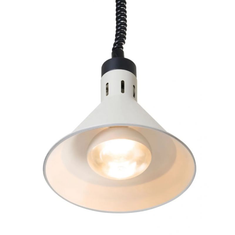 Лампа підігріву страв Hendi 273937 завдяки продуманому конічному дизайну ефективно концентрує тепло на обмеженій зоні, забезпечуючи рівномірний підігрів окремих порцій або готових страв без ризику пересушування, що особливо актуально для ресторанів, кафе, ліній роздачі та кейтерингу. Корпус виконаний з міцного алюмінію, що гарантує довговічність, стійкість до інтенсивної експлуатації та сучасний зовнішній вигляд, який гармонійно вписується в будь-який інтер'єр кухні або залу. Головною особливістю моделі є регульований шнур довжиною від 70 до 150 см, який дозволяє точно налаштовувати висоту лампи і, відповідно, інтенсивність теплового впливу, забезпечуючи максимальну гнучкість у роботі з різними типами страв і форматами подачі. Зручний вимикач, розташований у верхній частині конструкції, забезпечує швидкий доступ до управління, а ударостійка лампочка, що входить до комплекту, підвищує безпеку та надійність обладнання навіть при високих навантаженнях.Характеристики