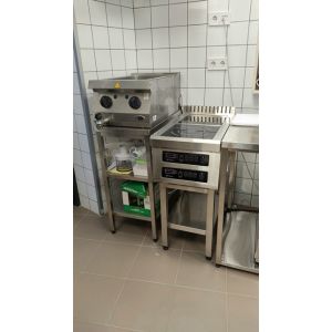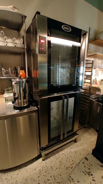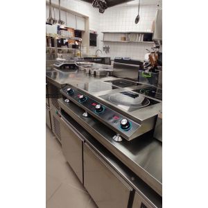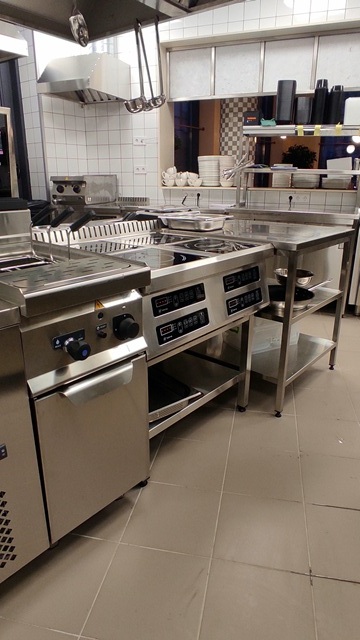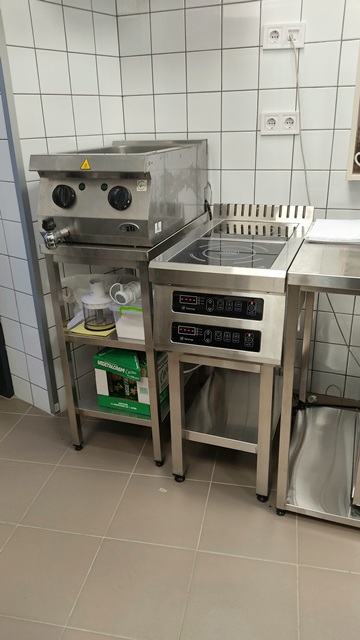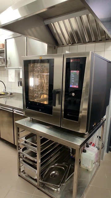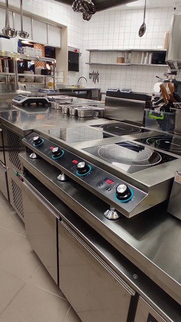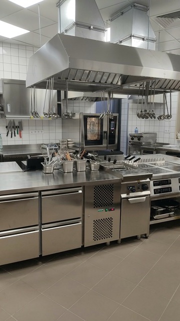 Для технологічних процесів приготування страв кухня була оснащена сучасним тепловим обладнанням. До складу поставки увійшли пароконвекційні печі BERTOS та Unox, які дозволяють готувати широкий асортимент страв з точним контролем температури та вологості. Для вистоювання тіста встановлено розстійну шафу Unox, а для приготування пасти — електричну макароноварку Bertos з комплектом професійних кошиків. Крім того, кухня обладнана газовою плитою Bertos, потужними індукційними плитами настільного та підлогового типу, електричною фритюрницею та тепловою шафою Moduline для підтримання температури готових страв.