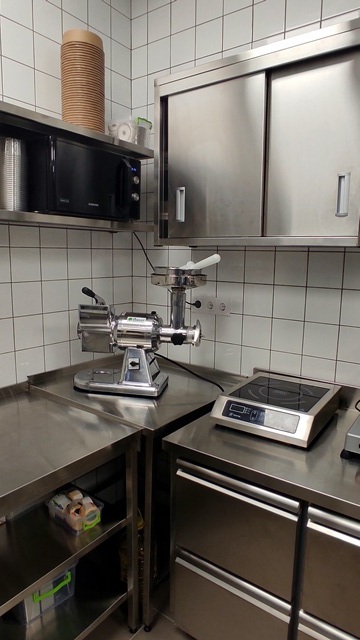 Окрему увагу було приділено обладнанню для підготовки інгредієнтів та прискорення виробничих процесів. На кухні встановлено професійну овочерізку Robot Coupe з комплектом дисків, спіральний тістоміс Mecnosud, блендер-міксер Sammic, м'ясорубку-терку Fimar, а також слайсер Beckers для нарізання продуктів. Таке оснащення значно підвищує продуктивність кухні та полегшує роботу персоналу.