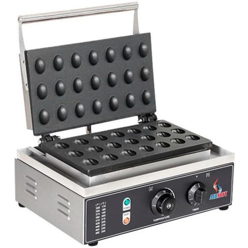 Горішниця Airhot WT-21 розроблена спеціально для стабільного та швидкого приготування популярного десерту «горішки» з начинкою, що стане чудовим рішенням для кафе, кондитерських, пекарень і точок вуличної торгівлі. Завдяки продуманій конструкції та надійним матеріалам модель підходить для інтенсивної експлуатації: робоча поверхня виконана з литого алюмінію з антипригарним покриттям, що забезпечує рівномірний розподіл тепла, запобігає прилипанню тіста та значно спрощує процес очищення. Форми для вафель представлені у вигляді порожнистих чарунок розміром 40х30х20 мм, що дозволяє отримувати акуратні половинки горішків, придатні для наповнення кремом, згущеним молоком або іншими начинкам. Вафельниця оснащена відкидною кришкою зі зручною горизонтальною ручкою, що забезпечує комфорт і безпеку під час роботи, а електромеханічна панель управління робить експлуатацію максимально простою та інтуїтивно зрозумілою. Плавне регулювання температури та функція автоматичного контролю дозволяють точно підтримувати заданий режим приготування, гарантуючи рівномірне просмажування кожної партії, а вбудований таймер допомагає оптимізувати робочий процес і уникнути пересушування виробів. Світлодіодні індикатори живлення та нагріву забезпечують повний контроль над роботою пристрою в режимі реального часу, що особливо важливо при високому завантаженні кухні. Ергономічний дизайн та компактні розміри роблять AIRHOT WT-21 NUT зручною для розміщення навіть на обмеженому робочому просторі, а висока продуктивність дозволяє швидко обслуговувати потік клієнтів і збільшувати прибуток закладу.Характеристики