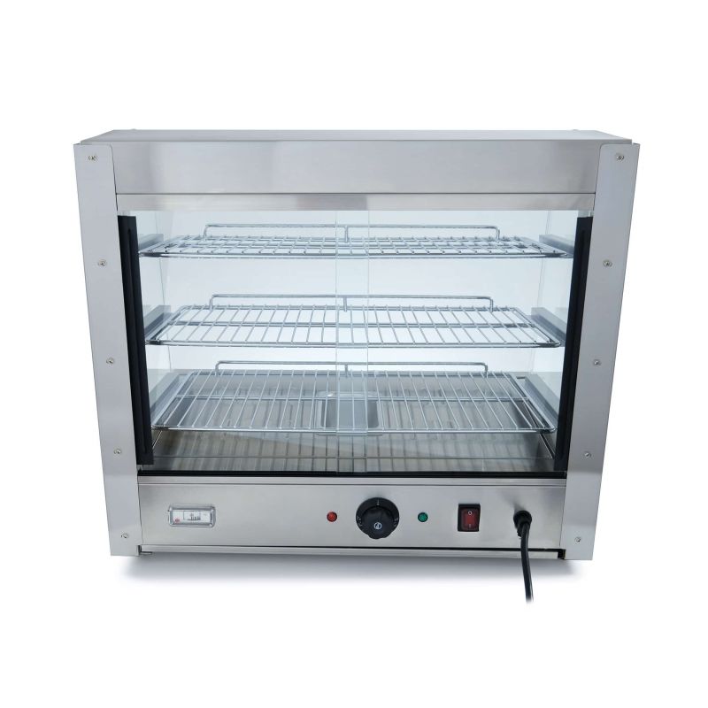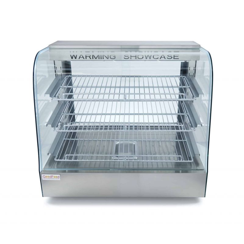 Тепловая витрина GoodFood WS200 STEEL создана для профессиональной демонстрации и поддержания готовых блюд в горячем состоянии, которое идеально подойдет для кафе, ресторанов, пекарен, фуд-кортов, точек уличной торговли, заведений быстрого питания и супермаркетов. Данная модель разработана для эффектной презентации и удобного хранения различных видов готовой продукции: вафель, кондитерских изделий, булочек, пирожков, выпечки, а также может использоваться как витрина для кур-гриль, позволяя сохранять их аппетитный внешний вид, аромат и оптимальную температуру подачи. Корпус витрины выполнен из прочной и гигиеничной нержавеющей стали, что гарантирует долговечность оборудования, устойчивость к интенсивной эксплуатации и простоту в уходе, а гнутое фронтальное стекло обеспечивает отличную обзорность продукции для покупателей и придает оборудованию современный и презентабельный внешний вид, который гармонично впишется в интерьер любой торговой точки. Внутреннее пространство витрины продумано для максимально удобной выкладки продукции: три вместительные полки — верхняя размером 560х255 мм, средняя 560х285 мм и нижняя 560х315 мм — позволяют рационально разместить широкий ассортимент блюд и выпечки, при этом предусмотрено десять вариантов крепления полок по вертикали с шагом 30 мм, что дает возможность гибко настраивать внутреннее пространство под разные размеры продукции. Для удобства обслуживания витрина оснащена двумя сдвижными дверцами размером 240х345 мм, которые обеспечивают быстрый доступ к продуктам со стороны персонала и помогают сохранять стабильную температуру внутри камеры. Температурный режим от 30 до 110 C позволяет поддерживать оптимальные условия хранения для различных видов готовых блюд, предотвращая их пересыхание и сохраняя свежесть и привлекательность. Дополнительное увлажнение воздуха внутри камеры обеспечивается специальной емкостью для воды размером 155х90х70 мм, благодаря чему продукция дольше сохраняет мягкость и аппетитный вид. Встроенная подсветка выгодно подчеркивает внешний вид блюд, делая витрину еще более привлекательной для клиентов и стимулируя импульсные покупки. Резиновые ножки обеспечивают устойчивость оборудования на рабочей поверхности и защищают столешницу от повреждений.Характеристики